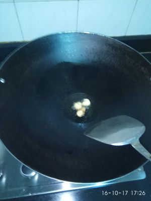 锅里放入适量的花生油,放入八角、大蒜、花椒、葱末炒出香味。
