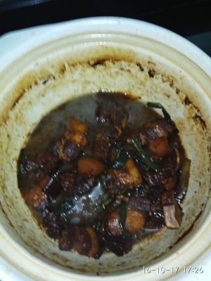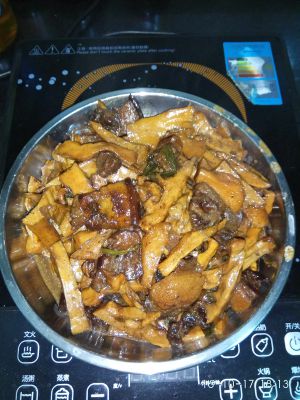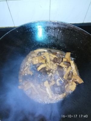 倒入香菇老抽,加入少许水,盖上锅盖焖十分钟左右