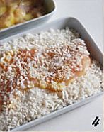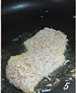 取出一片鸡肉片,双面沾上面包糠,在面包糠的盘子里压紧,尽可能的多沾一些