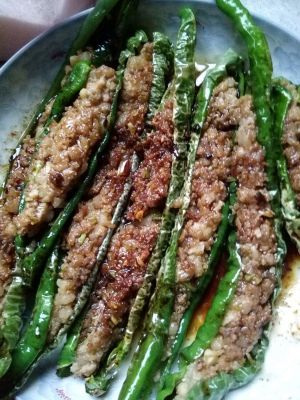 青椒洗干净切成两半,把里面的辣椒籽挖干净,要挖干净不然会有辣味的,然后就把剁好的肉馅酿进去辣椒里