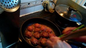 将肉馅做成乒乓球大小的丸子,500克肉馅差不多20个丸子。锅中倒入少许油,小火将丸子煎至两面金黄出锅。