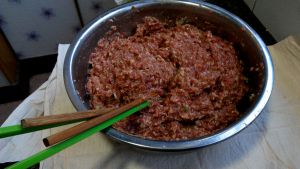 大葱切末,姜切末,莲藕去皮切末,都倒入肉馅中