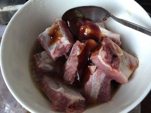 让卖家将排骨斩成两寸大小,然后洗净冲去血水后下所有调味料拌匀腌制12小时以上