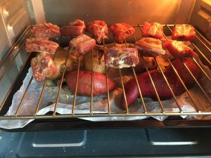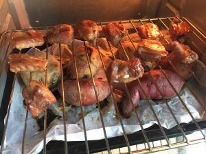 放入烤箱中层上下火250度30分钟,下面铺上油纸,我放了几个番薯一起烤