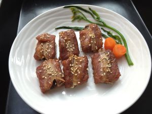 把肉拌料汁,放冰箱20分钟。取出后,小火煎熟