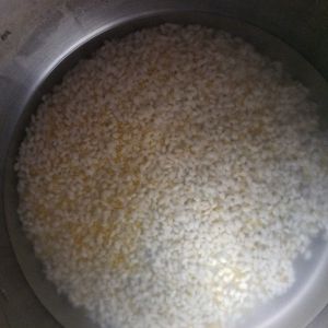 大米淘洗干净,放入煮鸡肉的汤锅里。