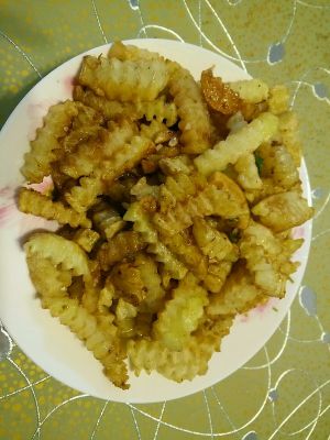 另起锅,加少量油,油热放生抽、盐、醋适量,加三四汤匙水,再加适量白糖,熬至粘稠,下炸好土豆条,快速轻拌,使土豆条均匀粘上汤汁,最后放葱、蒜末,撒孜然出锅,味道棒极了。