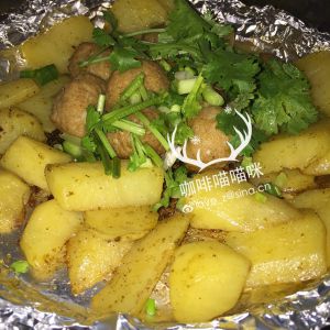 铁板上包一层锡纸,将土豆块放入,由于鸡肉丸子是半熟制品,待土豆煮用筷子可穿过,便可将鸡肉丸子放入,时不时要翻动,防止粘底