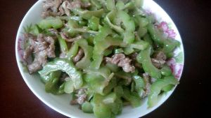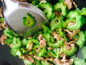 锅内放入油,放入腌好的牛肉,迅速翻炒几下,放入苦瓜继续翻炒