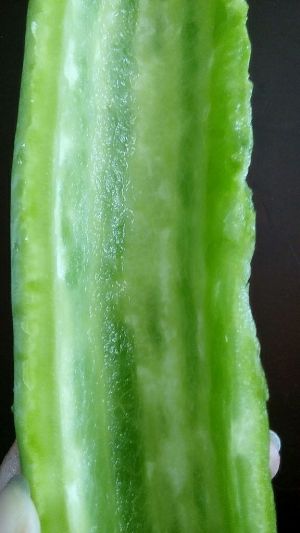 苦瓜去头尾,对半切开,选一个薄的不锈钢勺子刮掉馕,刮完后冲洗干净。