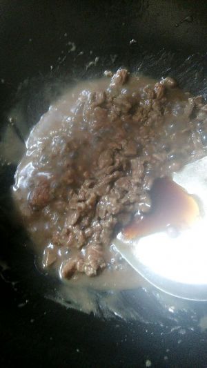不粘锅烧至六成熟倒入玉米油,倒入牛肉大火煸炒,加入老干妈煸炒至六成熟倒入备用