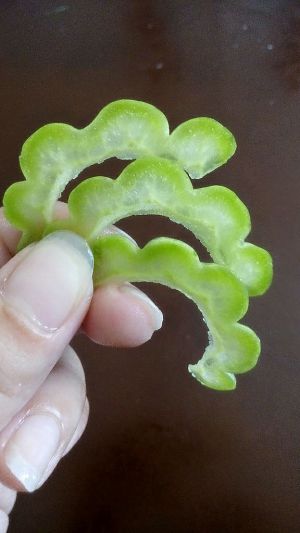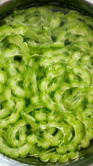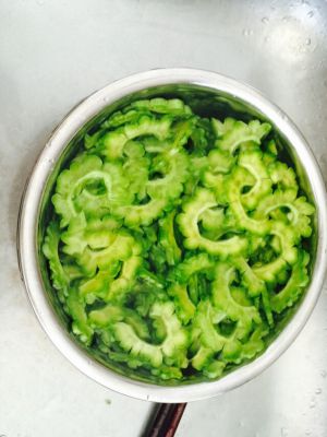 买回来的苦瓜洗净切片,然后泡盐水10~20分钟后,冲洗干净后沥干水分备用