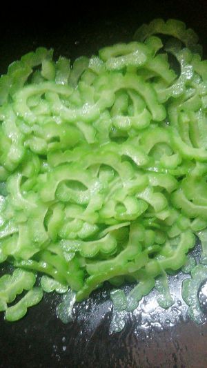 倒入刚刚处理好的苦瓜,翻炒片刻,加入盐巴少许,味精真的是一点点(不然苦瓜本 味还破坏了)