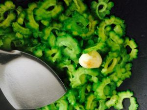 热锅倒油少许,拍蒜炒香,倒入苦瓜,清炒片刻(苦瓜变成好的鲜绿色,微软的时候)起锅装碗,备用