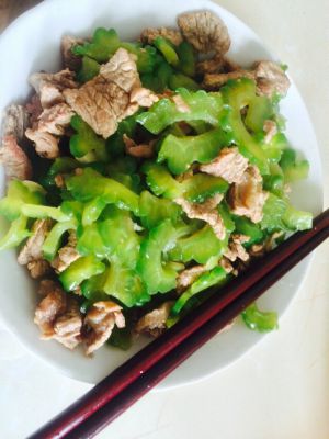加盐,出锅。都说苦瓜隔顿好吃,所以不要炒太久,牛肉也不会老。这样炒出来的牛肉嫩滑,苦瓜只有微微的苦,但完全可以接受。连我这个挑食的人在吃牛肉的时候偶尔也能嚼几口苦瓜。当然,剩下的全都进了老公的肚子。