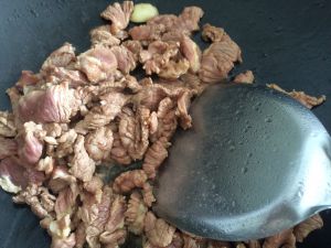 接着起锅倒油少许,拍蒜爆香,将牛肉5~7分熟(就是牛肉还带有血色)
