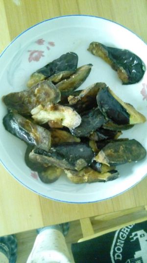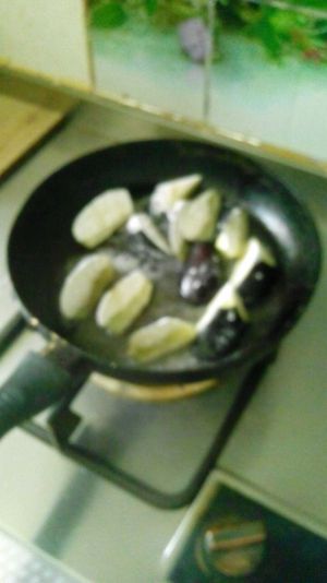 把茄子块裹上面粉,放在油锅里煎,直至软,焦黄,