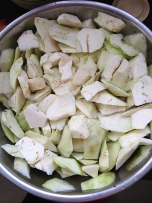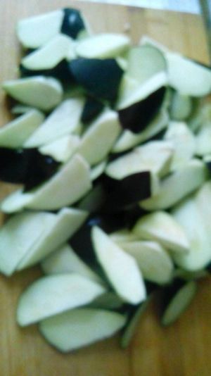茄子去皮切滚刀块,尽量大一点块。先沾淀粉糊,再沾干淀粉,放入油锅中炸。一定要热油下锅,在再转小火,炸至金黄即可。