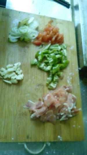 肉,青椒,西红柿切块,葱,姜,蒜,切片切丝,备用