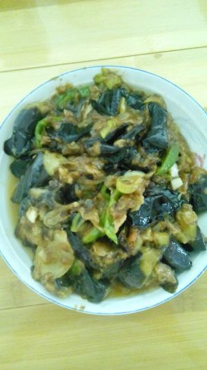 酱汁尝着味道正好时,调大火,迅速把茄子条和蒜一起倒进锅里,快速翻炒,茄子都挂上酱汁后迅速离火成盘,可以撒少许香菜。完成。