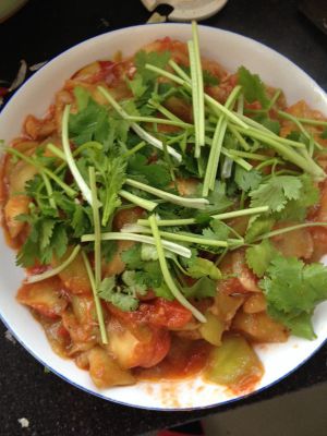 叮~完成~PS:不好意思哈哈香菜比较多,所以就都放上了!在出锅前把蒜末放入翻炒匀哦