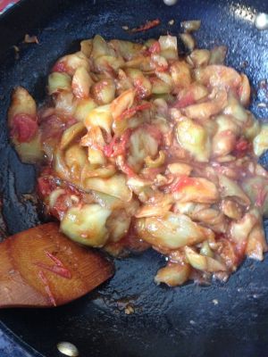 锅中再次放少量油,5成热时放一半蒜片炒香,加入番茄块翻炒,再倒入煎好的茄子块继续翻炒片刻。
