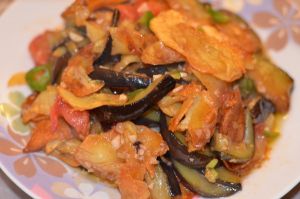 放入葱煸香后,再依次放入番茄和茄子煸炒,倒入生抽翻炒几下后,调入盐调味,再放入煎好的土豆片,和蒜末翻炒均匀就OK。