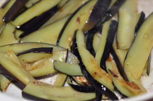 锅中油热后放入茄子,茄子绵软且吸入的油又吐出时,这样的茄子就煎好了。