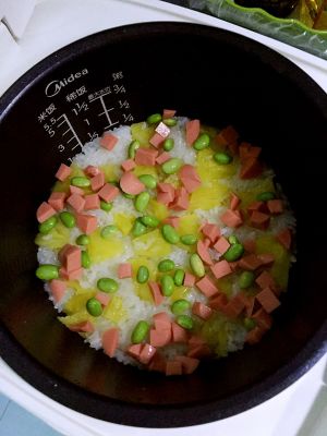 这个时候米还没煮好,还有点水没吸收~正好和好煮的青豆腊肠一起继续煮~(我家因为没存腊肠,所以没办法用了火腿肠,但有腊肠还是要放腊肠口感才比较融合)