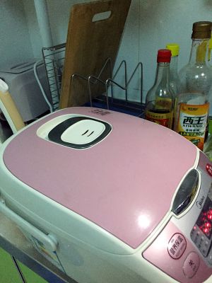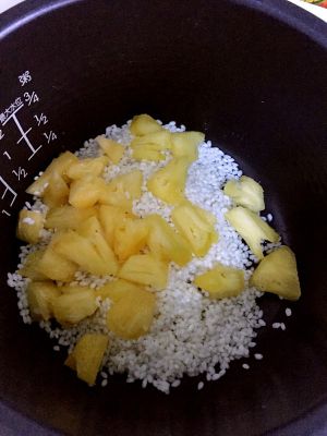 糯米泡1个小时,菠萝切小块~准备好就把糯米放到电饭煲里~菠萝也放进去~开始煮~(我试了标准煮,时间不算长,米不够糯,于是换成精华煮~就是时间很长的档~这次口感就很好了)