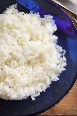 最后准备米饭,米饭我有点讲究。前一晚上先把米饭煮好,做炒饭的米饭我有个小诀窍在煮饭前在米饭锅里倒入两滴橄榄油,这样米饭煮出来会很光滑,颗粒分明。米饭冷却后放冰箱第二天待用即可。