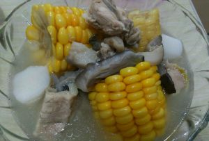 排骨凉水下锅 注意把沫撇干净了 然后放入葱 姜 八角 玉米 蘑菇 大火煮开 调小火 煮30分钟
