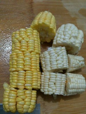 玉米去须洗净 切块 我们俩人 两根吃撑 所以酌量买-.-