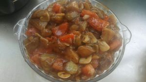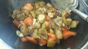 锅里当一勺油,加热,爆香葱姜。然后倒入调好的汁,2分钟左右浓稠后倒入辣椒胡萝卜,翻炒几下倒入茄子,继续翻炒。待汤汁包裹住茄子后倒入蒜末,继续翻炒两下出锅。不用放淀粉勾芡。因为茄子已经有面粉了。