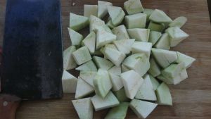 茄子切滚刀块 然后加入少许盐 腌制一会