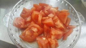 茄子炸完后,锅里留有少许底油,(无油也可以) 大火把锅烧热,将炸好的茄子和西红柿块以及蒜片一同倒入锅中翻炒几分钟,加盐、生抽继续翻炒,喜欢汤多的朋友可加入适量开水。之后加入鸡精,番茄酱翻炒均匀即可出锅。
