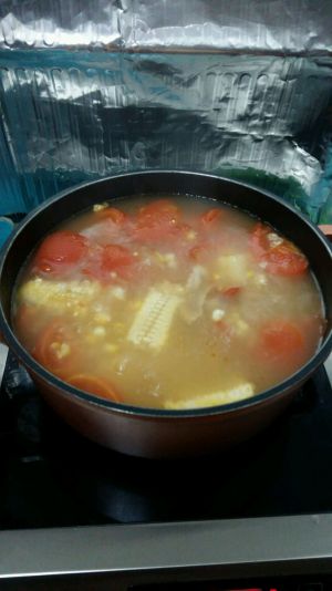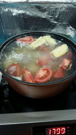 步骤:1 排骨煮滚水过水洗净,番茄,薯仔洗净切块,玉米取粒,玉米根切段一起备用煲,蜜枣两个,干姜丝少许!