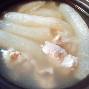 排骨、薏苡仁、冬瓜放入锅中,加2000毫升水以大火煮沸,转小火继续炖熟。加调味料即成。
