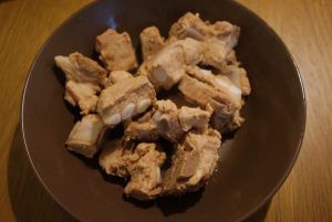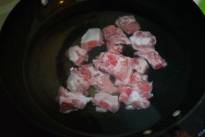 把排骨放到水中煮一下,把肉中的血沫子煮出来后,排骨捞出备用。
