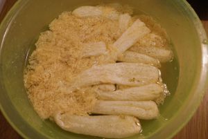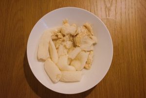 将泡好的竹荪捞出沥干水,切掉菌盖、摘除竹荪的花朵部分(即另一端网状部分)