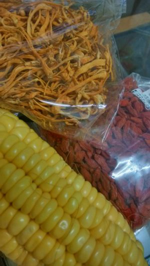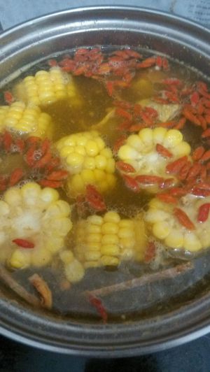 排骨烫好加水,玉米段,金虫草,枸杞子,莲子,姜片,炖一个半小时
