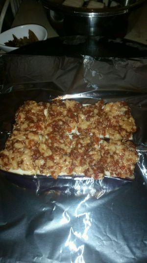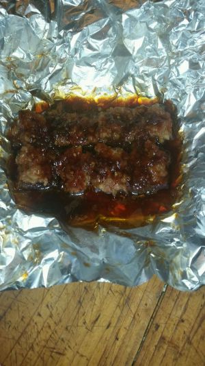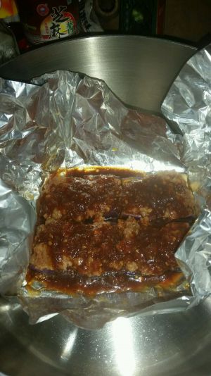 8分钟开盖,打开锡箔,淋入调好的蕃茄酱汁包好锡箔,300w2分钟。
