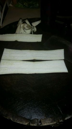 茄子两面去皮,用刀拉几条口子,方便入味。
