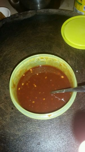 趁烧茄子的功夫,调蕃茄酱。水淀粉、蕃茄酱、蚝油,调匀待用。