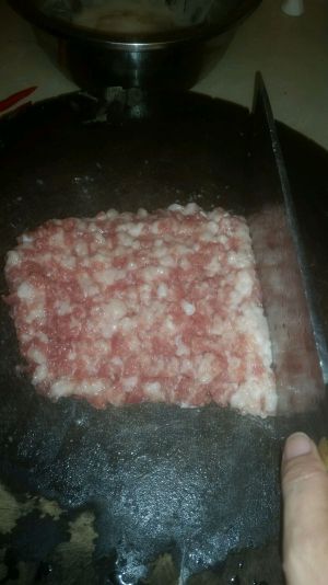 五花肉洗净剁成肉糜,不要太烂,小颗粒状比较有口感。剁好、调味腌制。