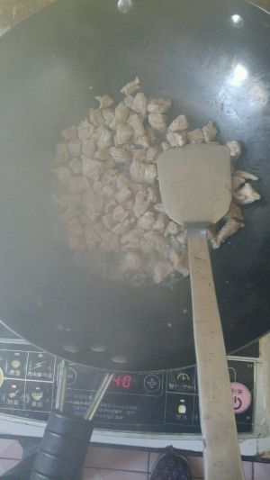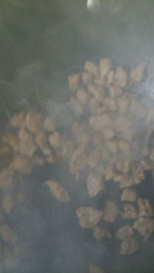 热锅凉油,加入羊肉,如果腌制结束后,水分比较多的话,适当抓一点生粉,油可以稍微多一些,我这个时间略短,建议多煸一会,肉会更香。
