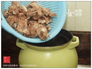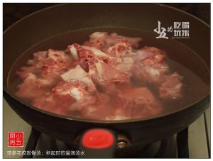 锅做清水放入焯好的排骨和葱、姜、蒜、花椒、大料、小茴香,烧开后撇去浮沫,放入绍酒。