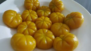 用牙签压出楞道,少量糯米粉加水和一点黄瓜汁和成团做成南瓜柄安上。