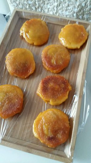 5.把锅洗干净下油,把火调到最小摆下做好的南瓜饼,每隔几秒钟就把南瓜饼翻一次,这样可以防止南瓜饼煎焦了!
