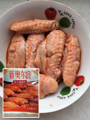 把所有原料都放进一个干净的碗里,鸡翅我头天晚上都腌上了,有10个小时,越久越入味哦……我用的是这款奥尔良腌料……